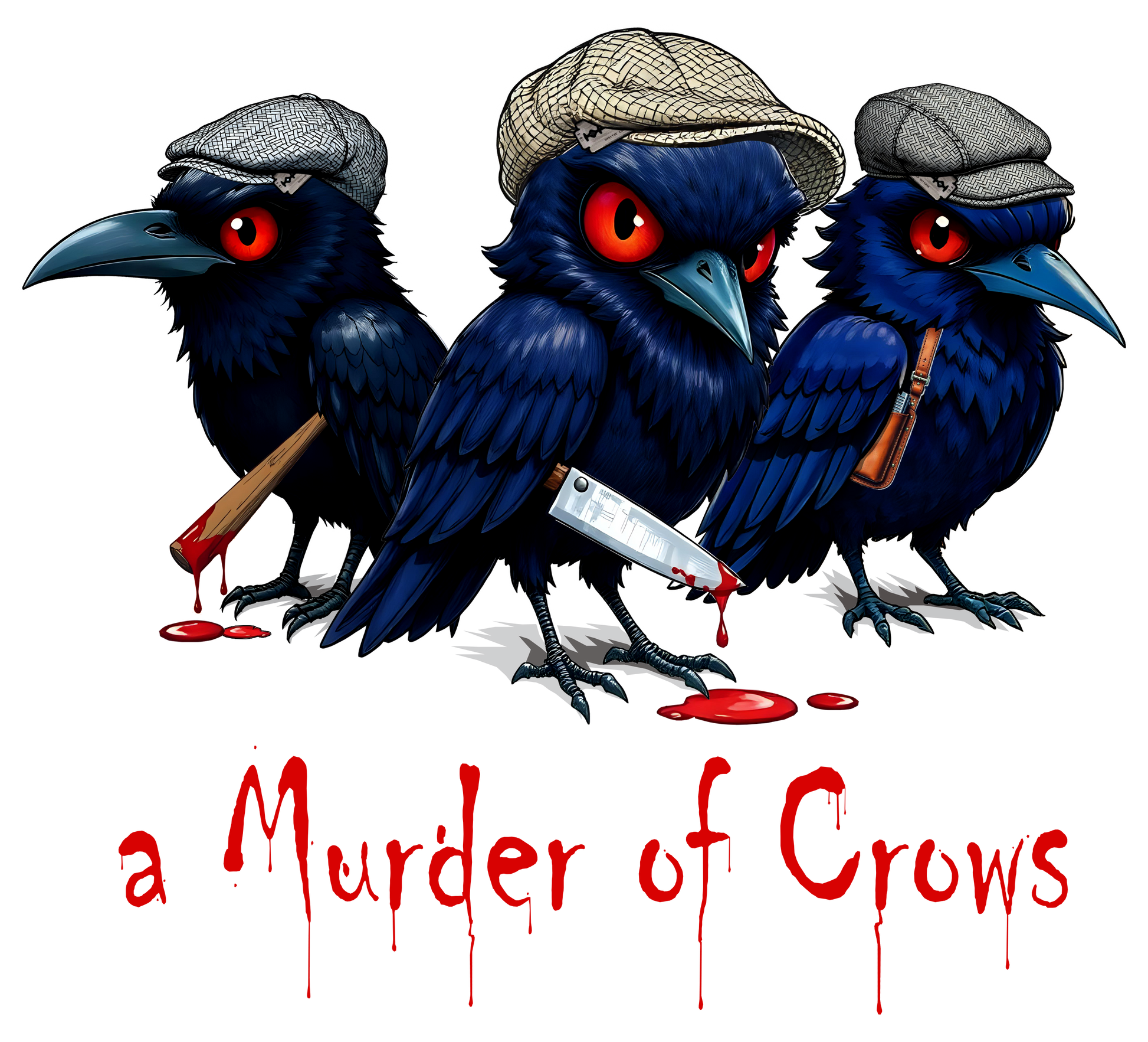 A Murder of Crows Unisex Cotton Hoodie featuring three crows with fierce red eyes dressed like wise guys, each sporting a Boston Scully style cap with a weapon. This hoodie exudes a cool and edgy vibe, perfect for those who appreciate unique and quirky designs. It is relevant for Halloween, goth fashion lovers, and those who enjoy dark humor.