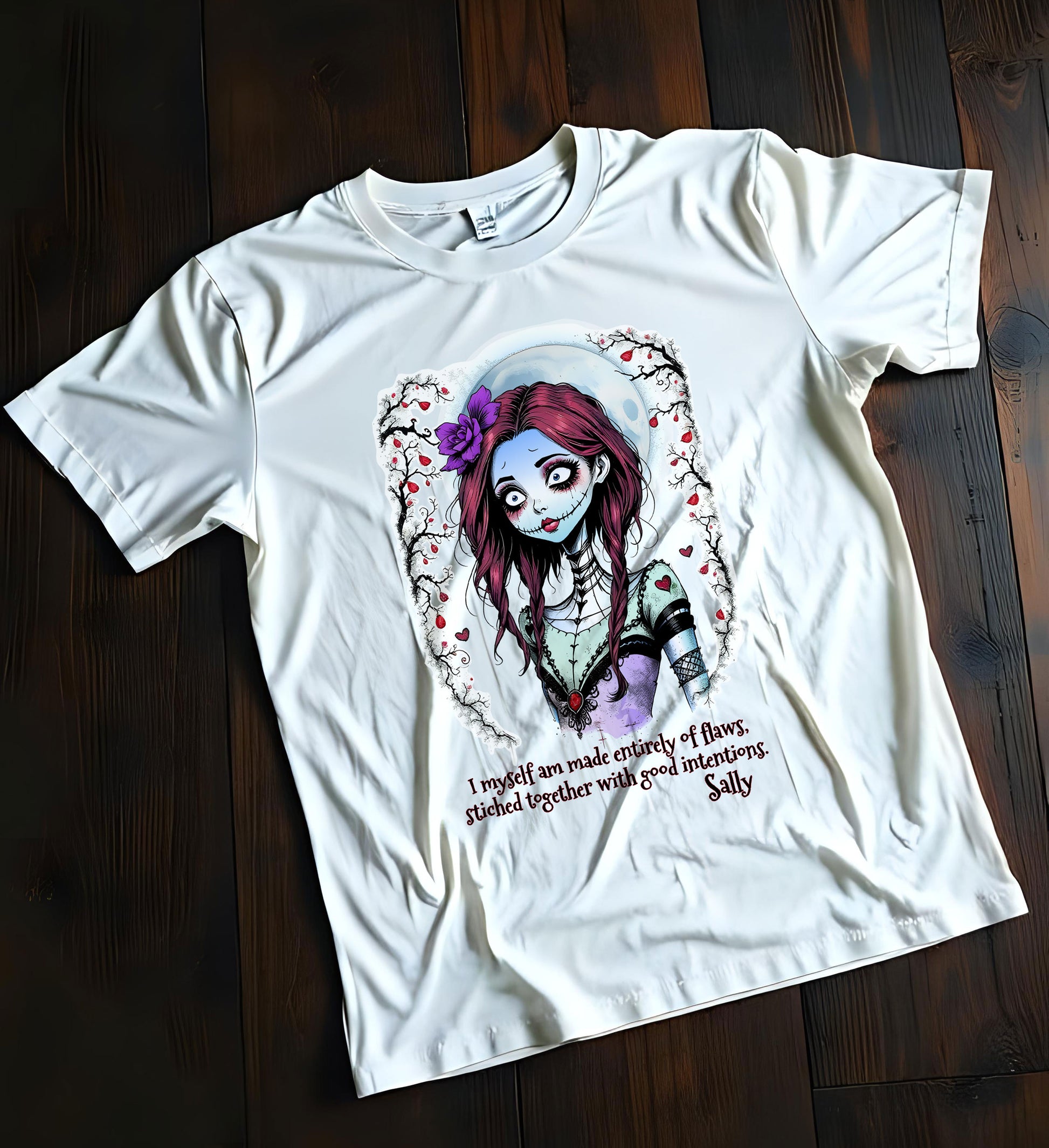 Join the cult of Sally with this stunningly stylized T-shirt featuring Sally from a Nightmare Before Christmas. Her iconic quote, "I myself am entirely made of Flaws, stitched together with good intentions," adds depth to the design. Perfect for collectors of Jack and Sally merch, this unisex cotton t-shirt is a must-have for any fan.