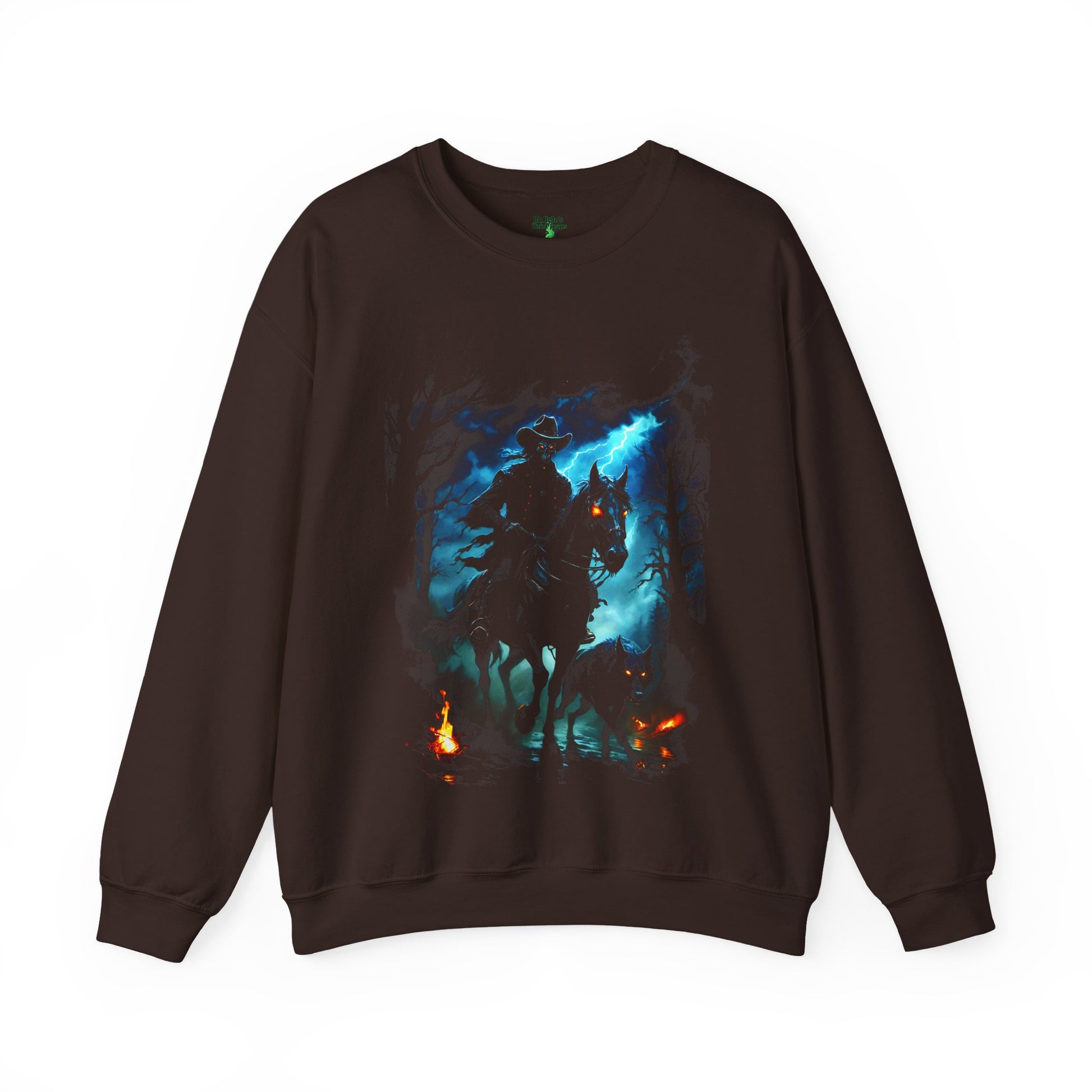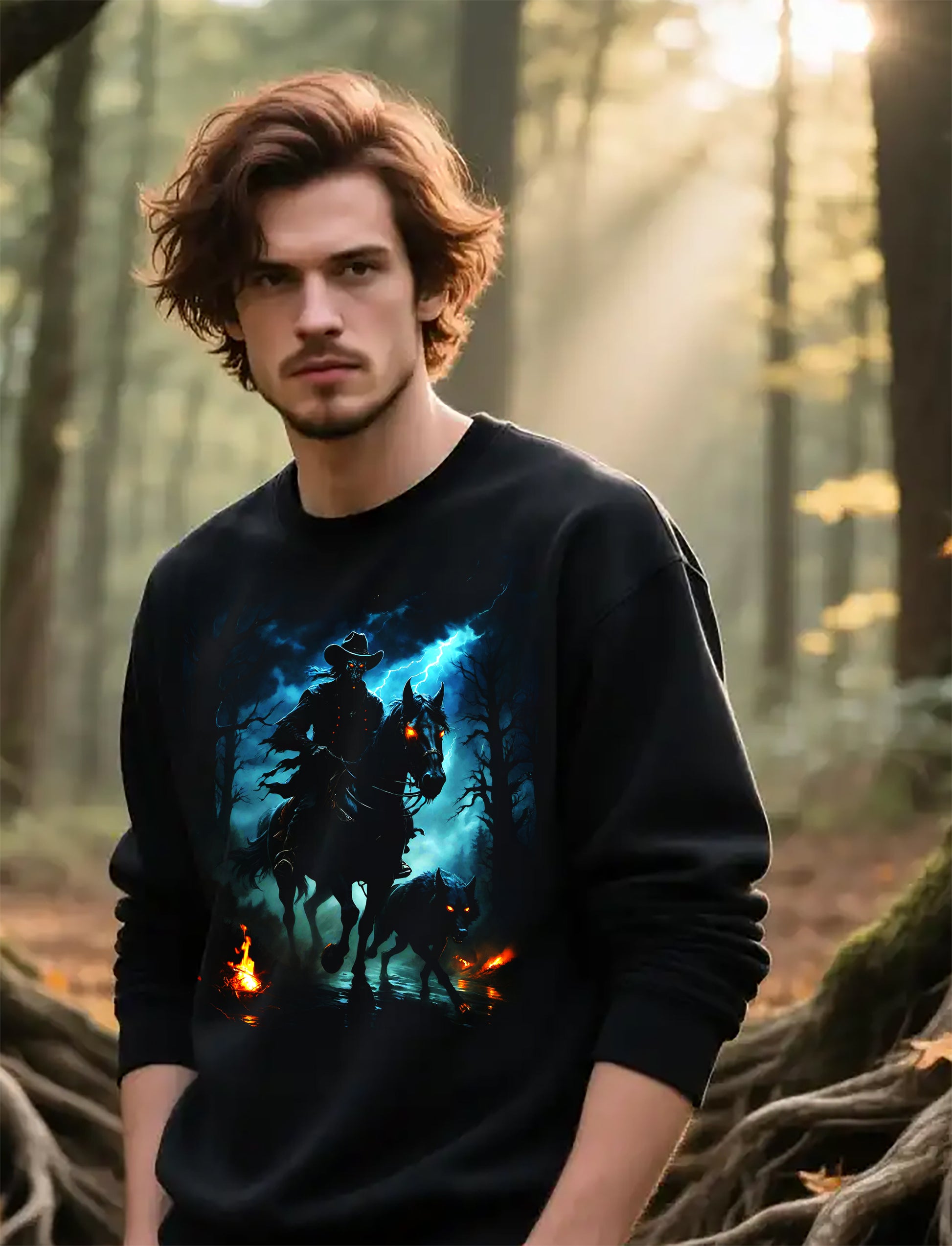 This warm cotton sweatshirt is stunning with a ghostly rider and his wolf companion seem to emerge from this shirt as grisly specters. This sweatshirts is giving off "Riders on the Storm" vibes. The thicker, vintage-feel cotton gives the print a muted, lasting look while the tubular knit and shoulder tape keep the silhouette clean and comfortable. Wear it on crisp nights when stories around the fire lean toward the eerie; it settles into layered wardrobes and late-evening walks with an effortless, brooding presence. The Gildan 18000 sweatshirt is a unisex heavy blend crewneck made from a 50/50 cotton-polyester fabric, combining softness with lasting durability. Its smooth surface supports crisp, vibrant prints and embroidery, while the ribbed-knit collar and reinforced cuffs help it keep its shape over time. A seamless body design reduces irritation and adds to overall comfort. Practical, sturdy, and print-friendly, the Gildan 18000 sweatshirt remains a top choice for custom apparel.