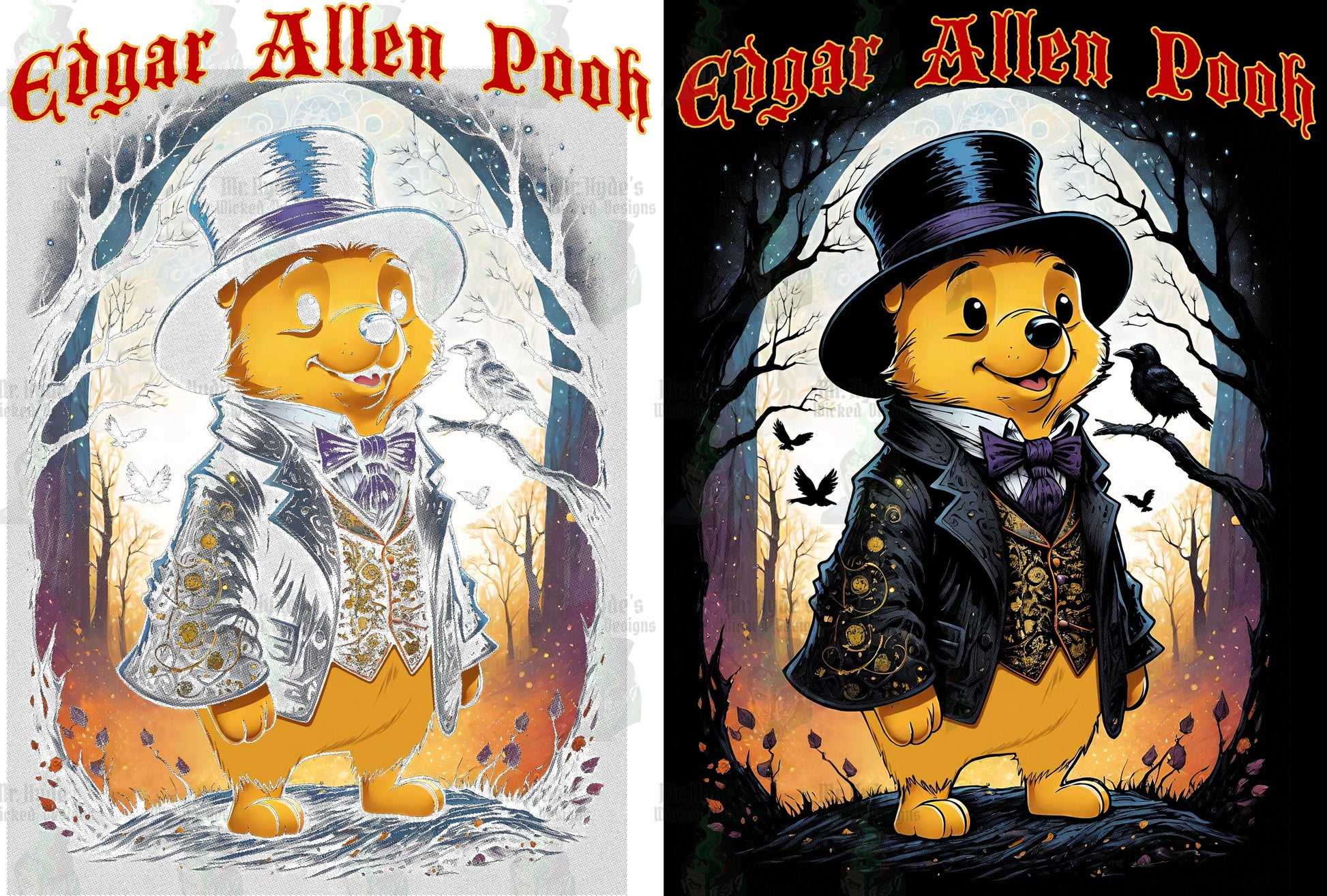If you are a fan of Winnie the Pooh. or a fan of Edgar Allen Poe you are going to love this Winnie the Pooh T-shirt I like to call "Edgar Allen Pooh". This hilarious heartwarming parody t-shirt will have be the jewel of your t-shirt collection. As far as Edgar Allen Poe t-shirts go this is about as heartwarming as it gets. This funny horror t-shirt makes a great Halloween t-shirt for kids of all ages. Available in both Adults and Youth sizes you are going to have to get one for each member of your household so they don't wear yours all the time. This wonderfully endearing Winnie the Pooh shirt is a must for any Winnie the Pooh collector. This stunning design is a black knockout halftone, meaning that all of the black area are knocked out so the black areas are fabric instead of ink. This makes for an extremely light design that feels great on a soft 100% cotton t-shirt. Get yours today, and be the first one in your neighborhood with your very own Edgar Allen Pooh t-shirt. This delightful Winnie the Pooh Youth t-shirt will be your child's favorite when all their friends are clamoring to find out where they found this whimsical mash-up.